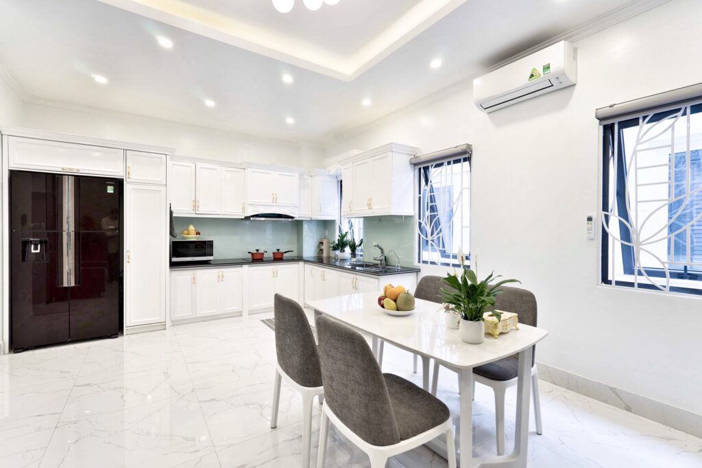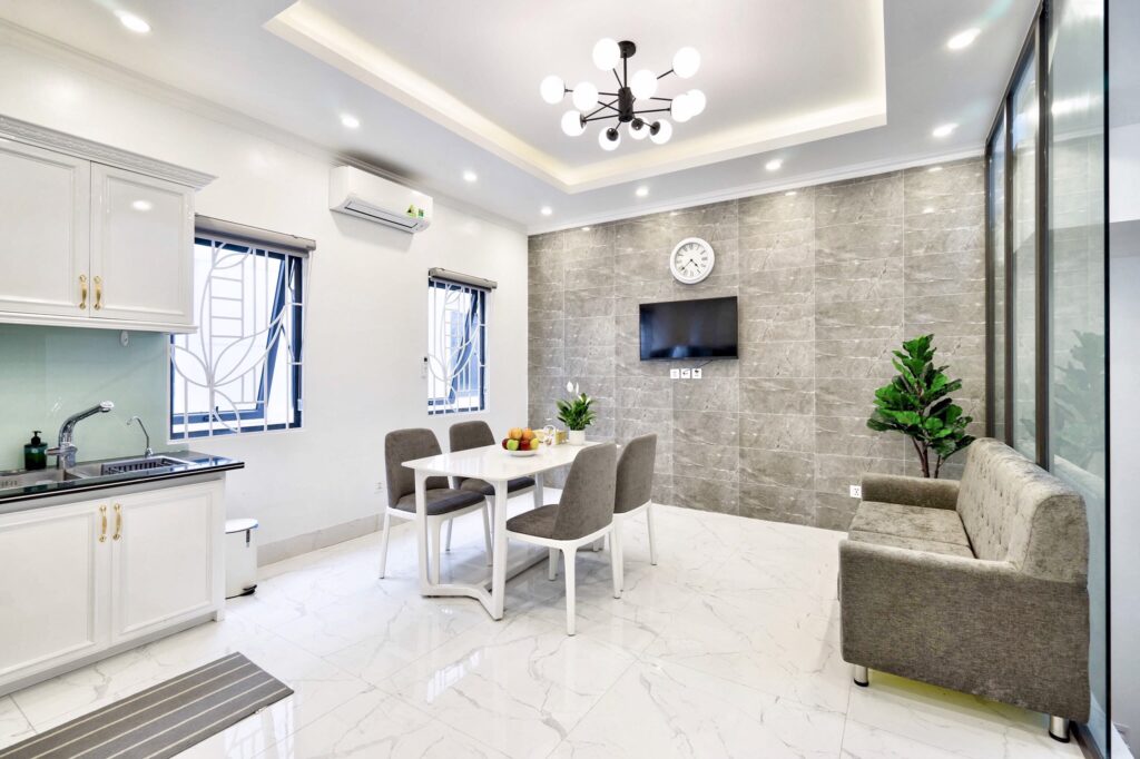 – Tiện nghi : tivi , tủ lạnh ( mỗi phòng đều có tủ riêng) + 1 tủ lạnh to 2 cánh ở bếp, lò vi sóng, nóng lạnh, máy phát điện (khi mất điện toàn cư dân), điều hoà, bình siêu tốc, nồi lẩu, bếp nướng bbq trên sân thượng đồ nấu ăn cơ bản + gia vị + bát đũa