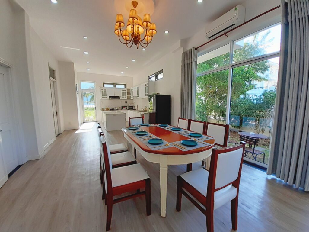 5 phòng ngủ, 1 phòng khách, 1 phòng bếp với đầy đủ trang thiết bị như tivi, điều hòa, tủ lạnh, bếp nấu, dụng cụ nấu, lò vi sóng,… Villa phù hợp cho đoàn gia đình, bạn bè khoảng 10 – 14 người