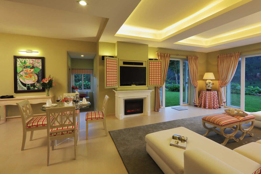 - Phòng khách được trang bị lò sưởi và TV truyền hình đa phương tiện