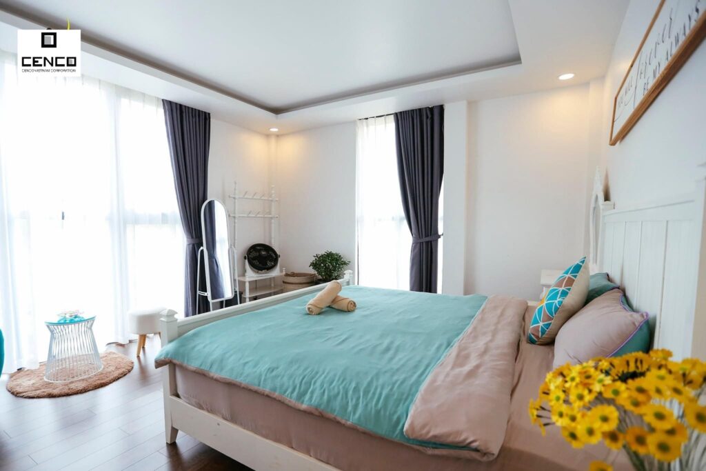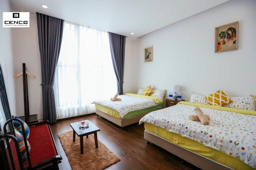 – Gồm 9 phòng , 8wc : 1 phòng 2 giường ( 1m8) , 3 phòng 1 giường ( 2m ) . 3 phòng áp mái 1 giường ( 1m8 ) , 2 phòng 1 giường ( 1m6) , sức chứa tiêu chuẩn 20 người lớn , có thể kê thêm nệm cho 8-10 người