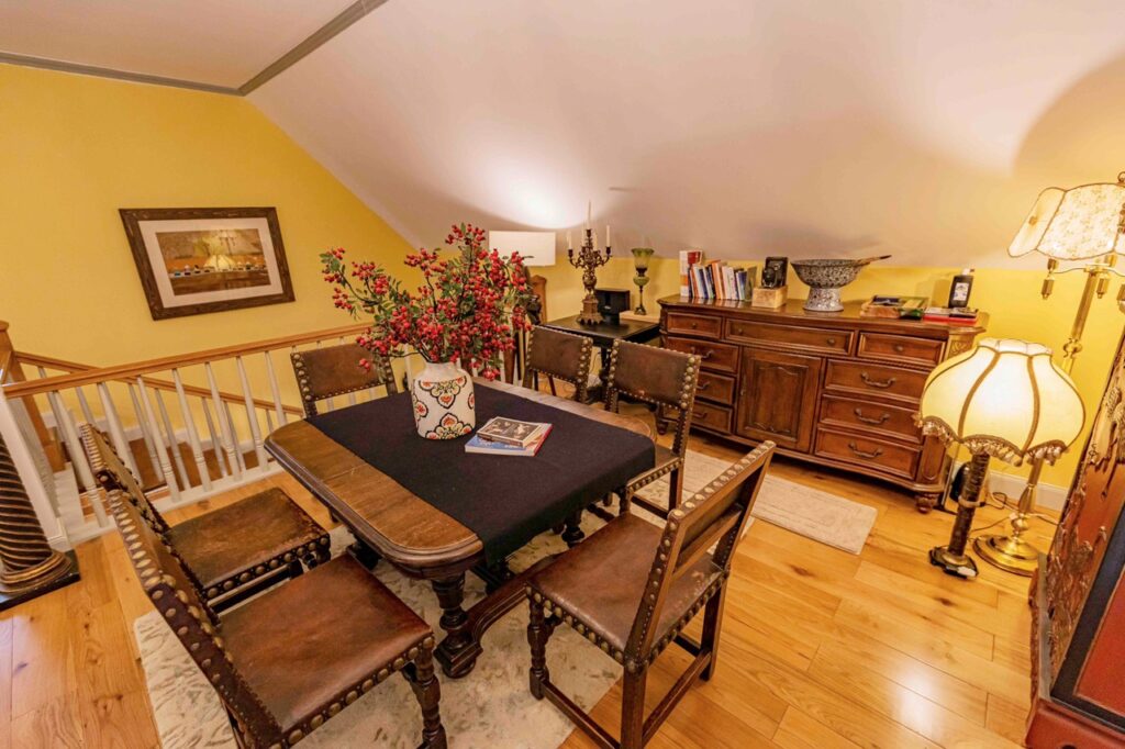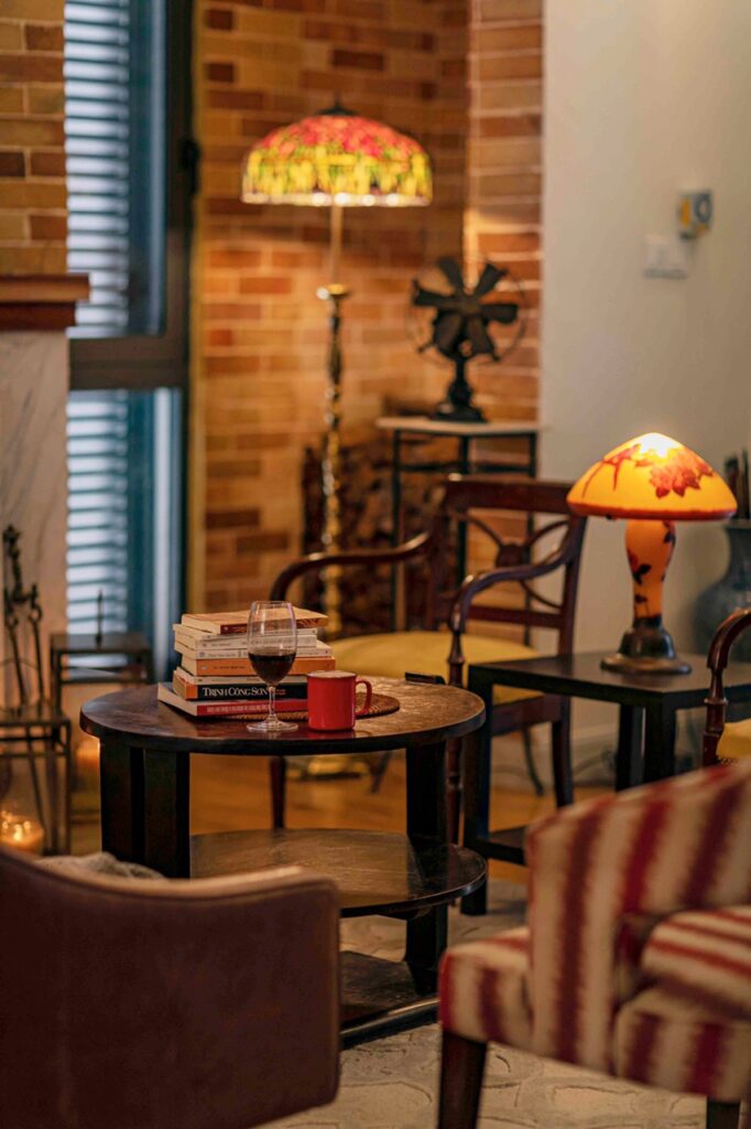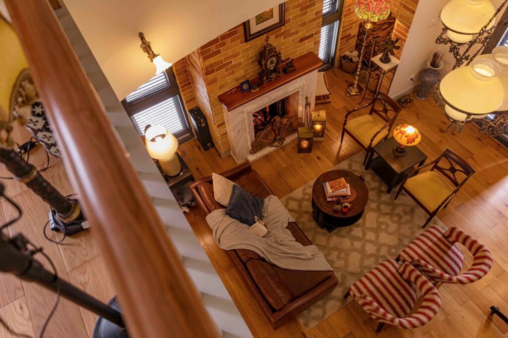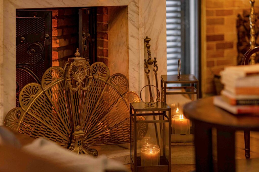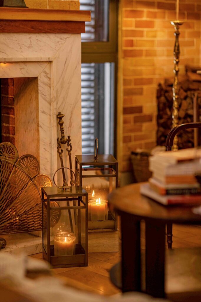 – Phòng khách với lò sưởi đốt củi ấm cúng