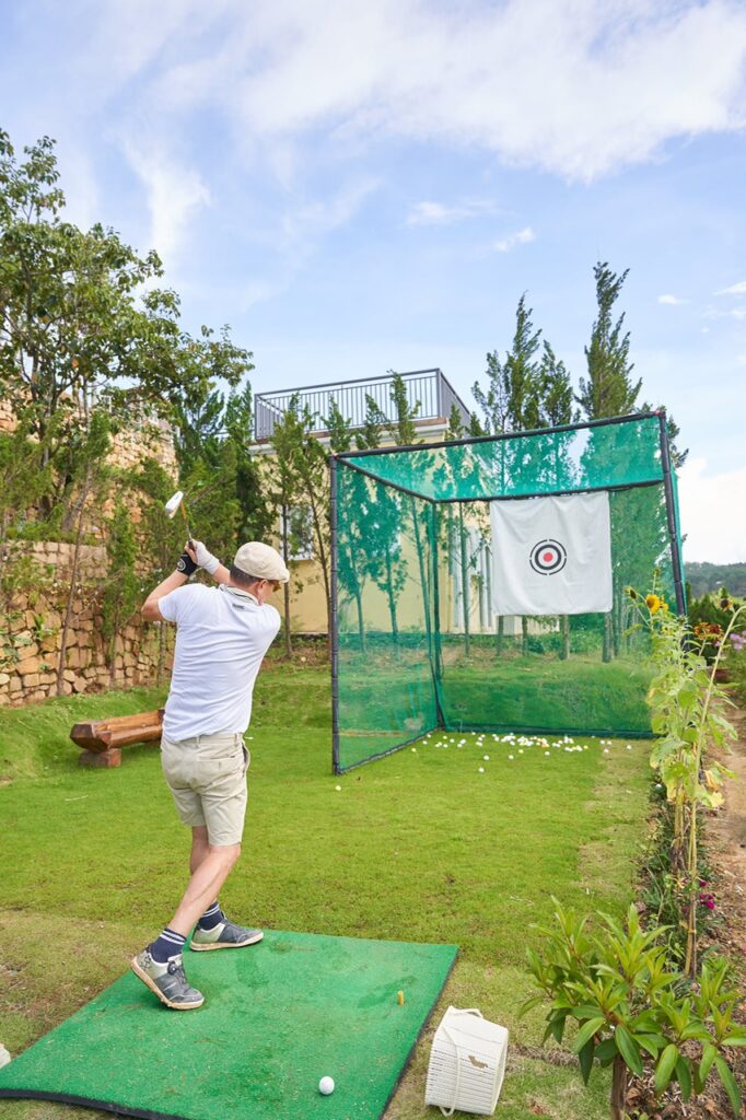 – Một sân tập swing golf trên thảm cỏ thật ngoài trời cho tín đồ mê golf Đalat, các bạn có thể vừa chơi, vừa thưởng thức BBQ với 2 lò sưởi bằng củi bên trong nhà và ngoài sân.