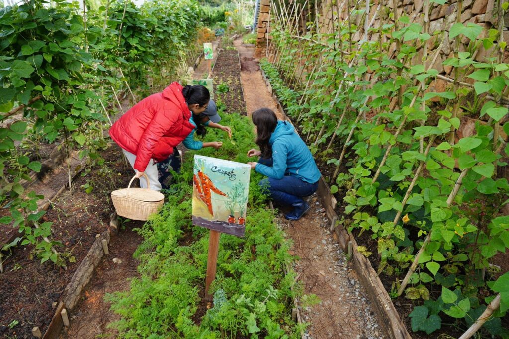 – 2,000m2 vườn trồng theo luống raised bed hoàn toàn hữu cơ khép kín, thoả sức hái và sử dụng các sản phẩm rau củ quả 100% organic xanh mướt.