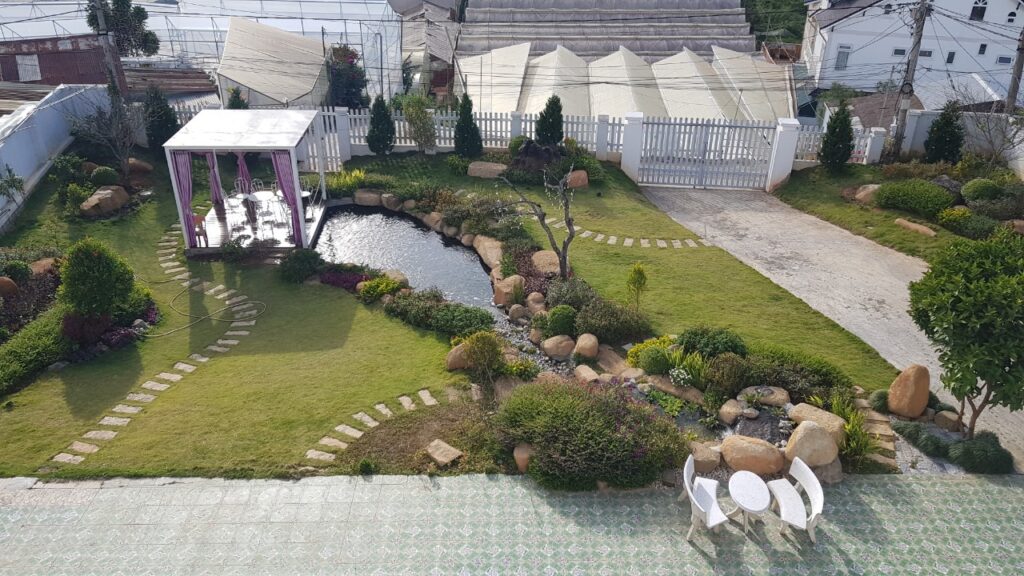 ✔️ Sân vườn 1000m được trồng nhiều loại hoa khác nhau, hồ cá koi sinh động tạo nên một không gian cực kì nên thơ