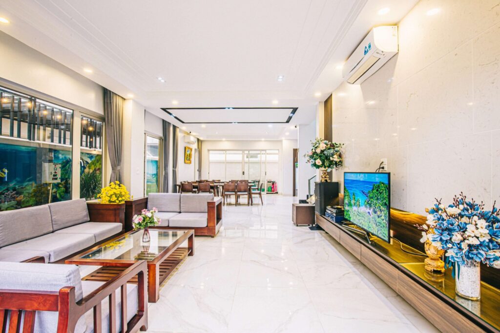 - Phòng khách: Tivi 75inch, bàn ghế tiếp khách, wifi tốc độ cao, hệ thống âm thanh karaoke, điều hòa