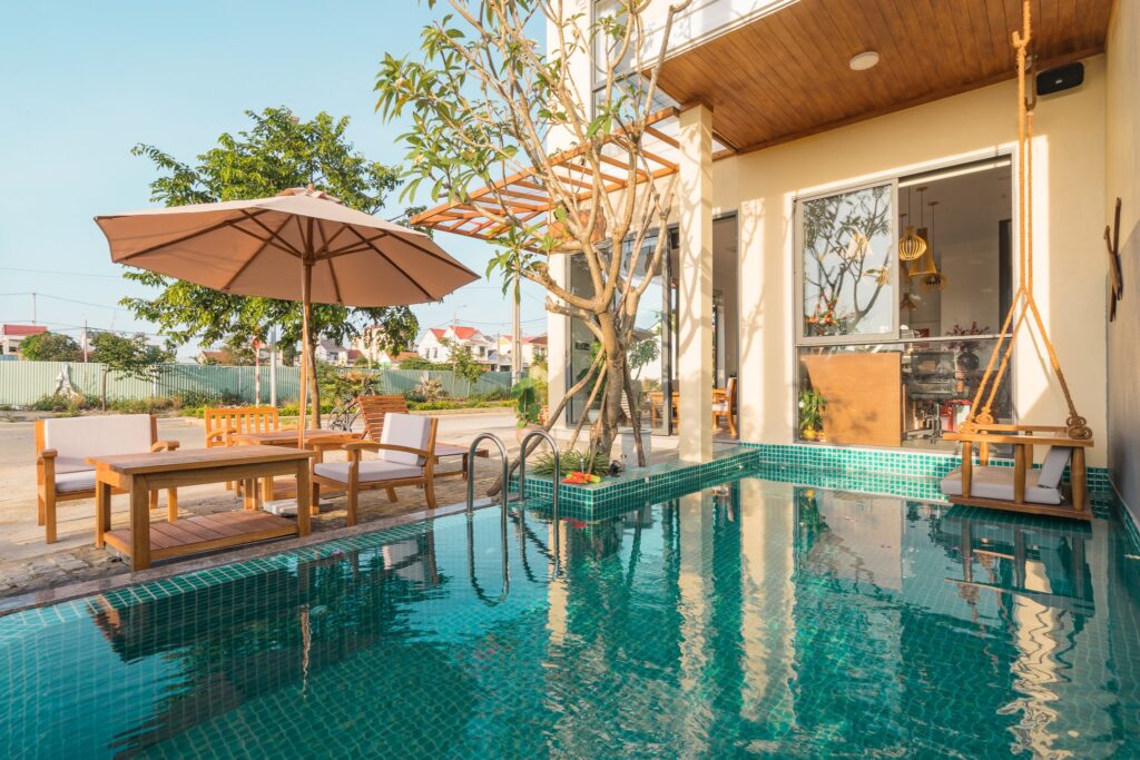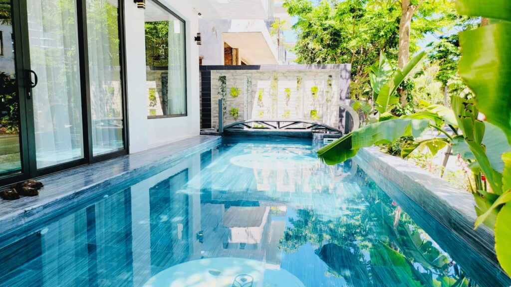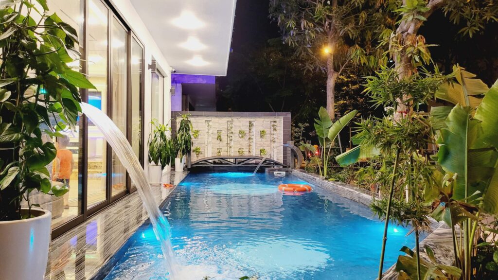 - Sân vườn rộng rãi thích hợp để tổ chức pool party, gala dinner