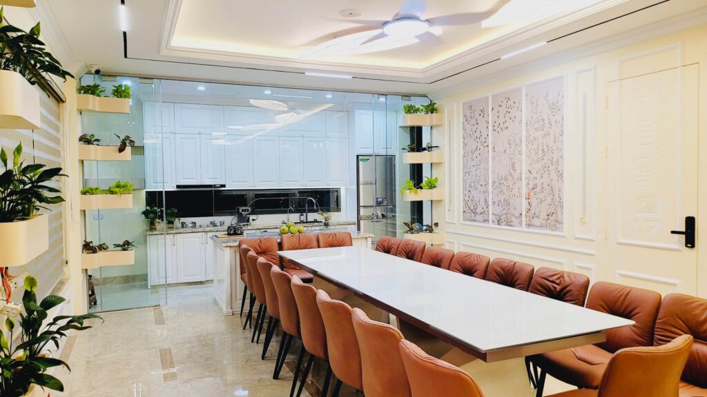 - Phòng khách: Tivi 75inch, bàn ghế tiếp khách, wifi tốc độ cao, điều hòa