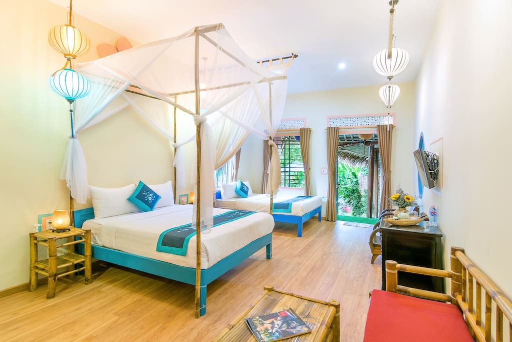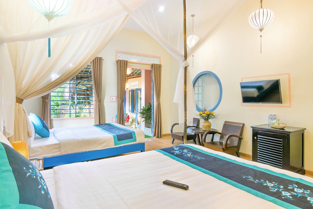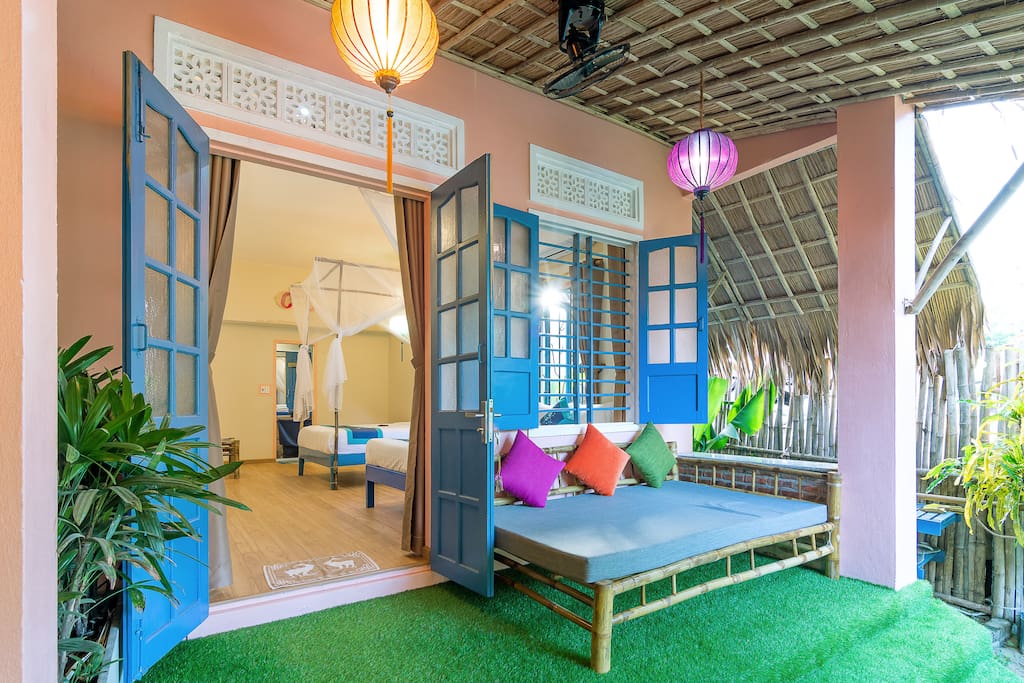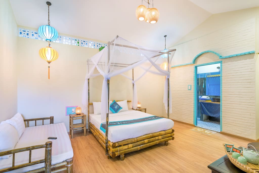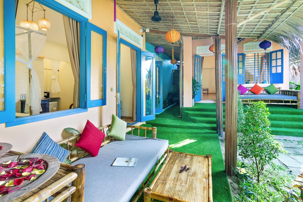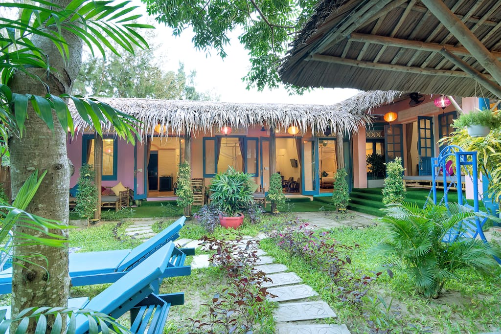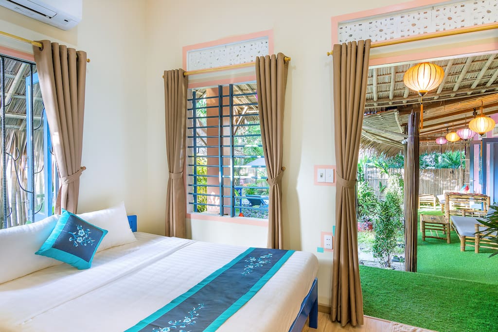 - Phòng ngủ riêng rộng rãi nằm ngay cạnh bãi biển của bạn được trang bị giường đôi cỡ queen, nhà vệ sinh và phòng tắm, máy lạnh, TV màn hình phẳng, tủ lạnh, ghế sofa tre trong và ngoài sân hiên của bạn.