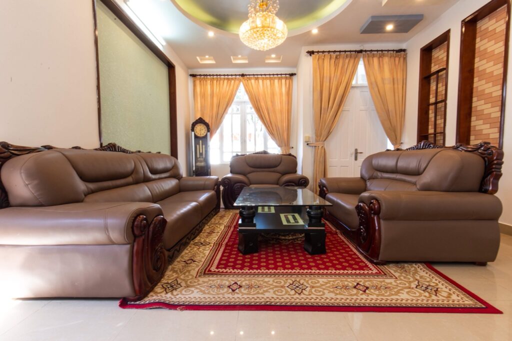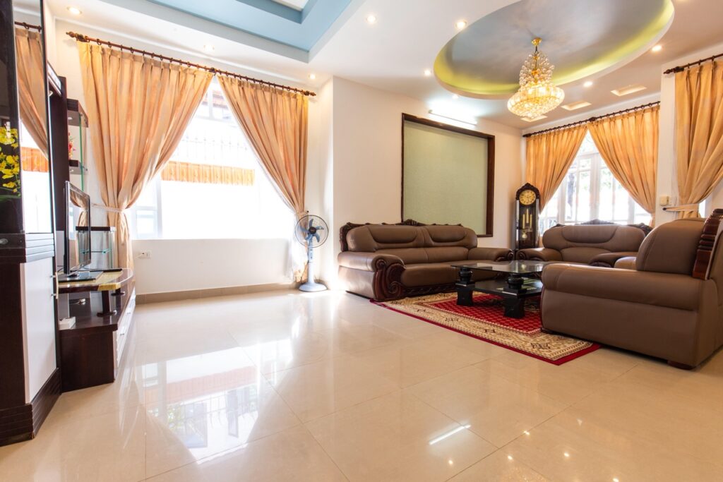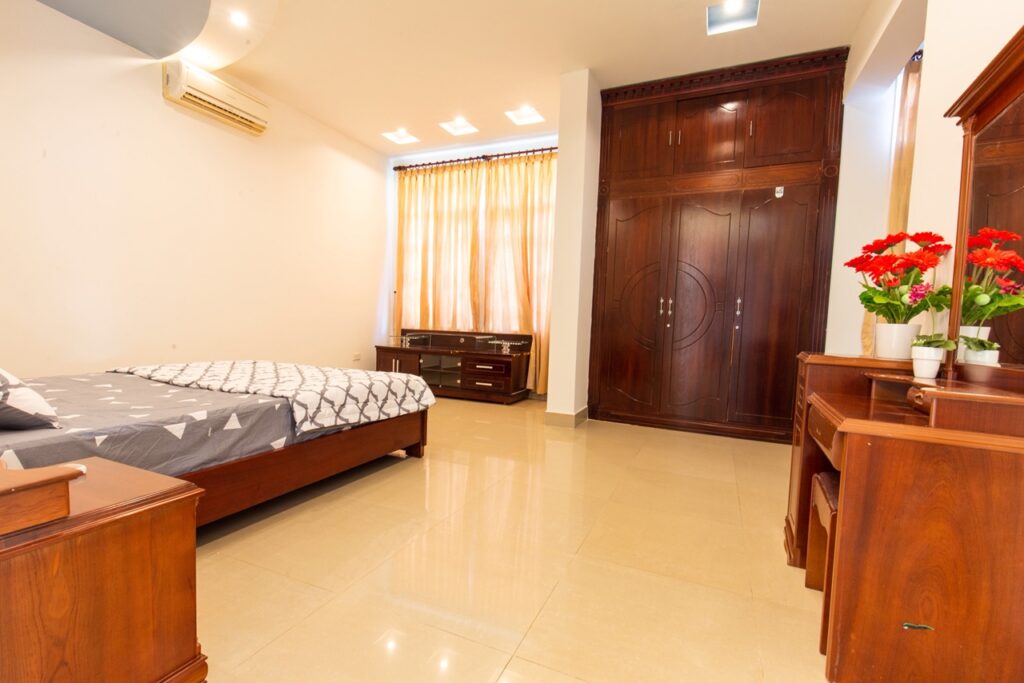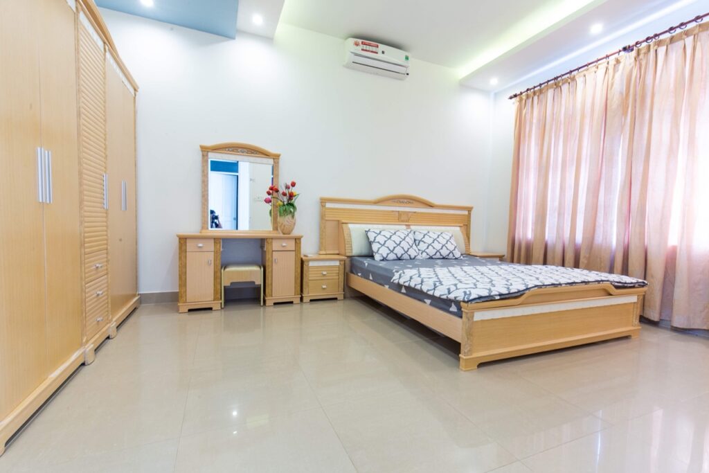 – Thiết kế: Diện tích sử dụng trên 300m2 với 01 phòng khách, 5 phòng ngủ – 5 giường đôi và nệm dự phòng, đồ nội thất cao cấp, sang trọng tiêu chuẩn khách sạn; 04 phòng tắm đầy đủ khăn và đồ dùng cá nhân, với bồn tắm và tắm đứng.