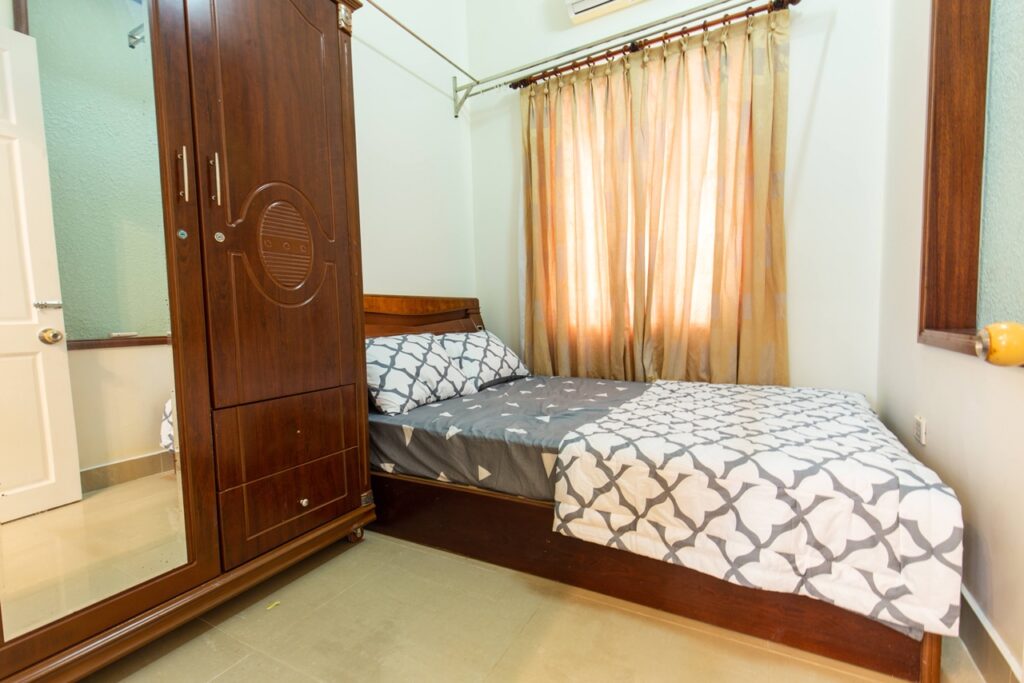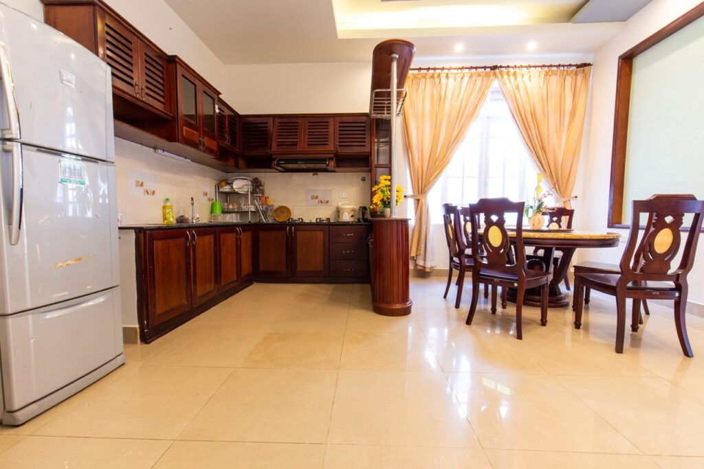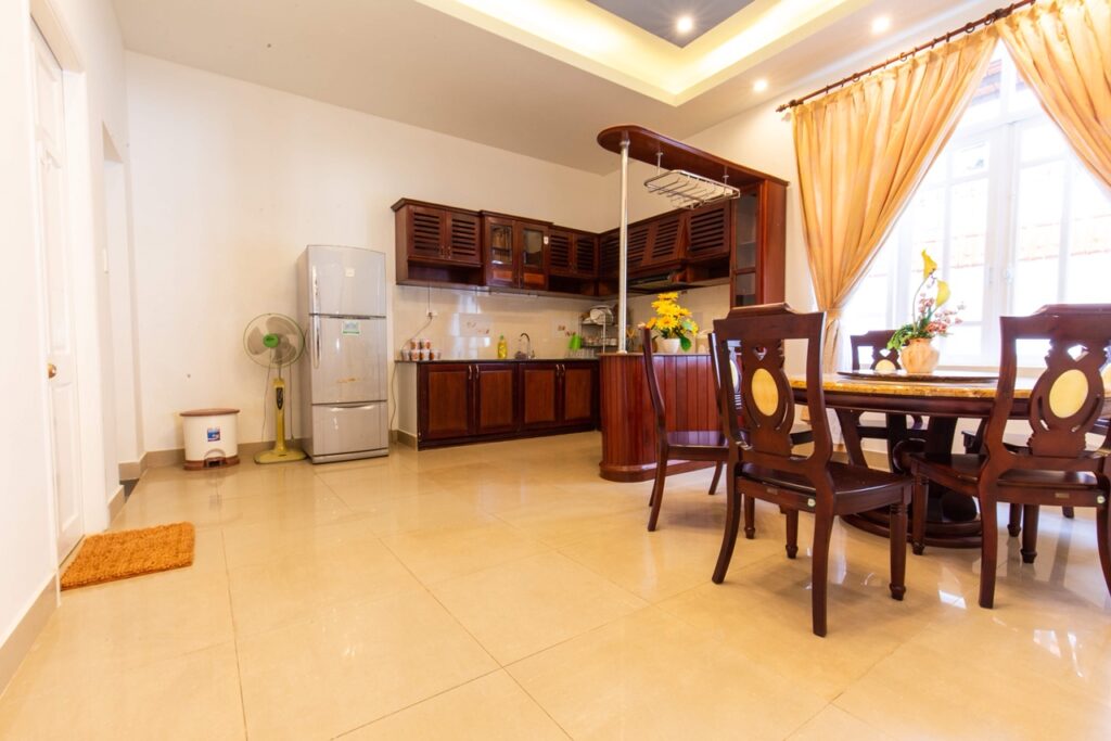– Phòng bếp rộng rãi, đầy đủ đồ dùng nấu bếp: lò vi sóng, lò nướng, nồi cơm điện, bình đun siêu tốc, tủ lạnh, chén bát…
