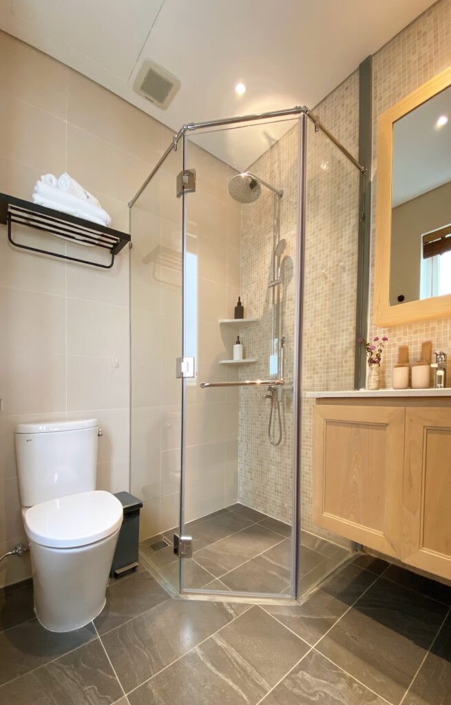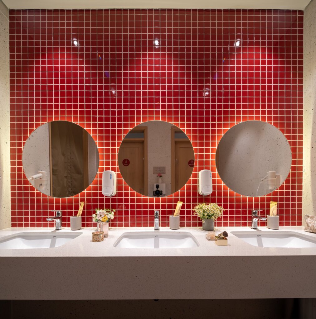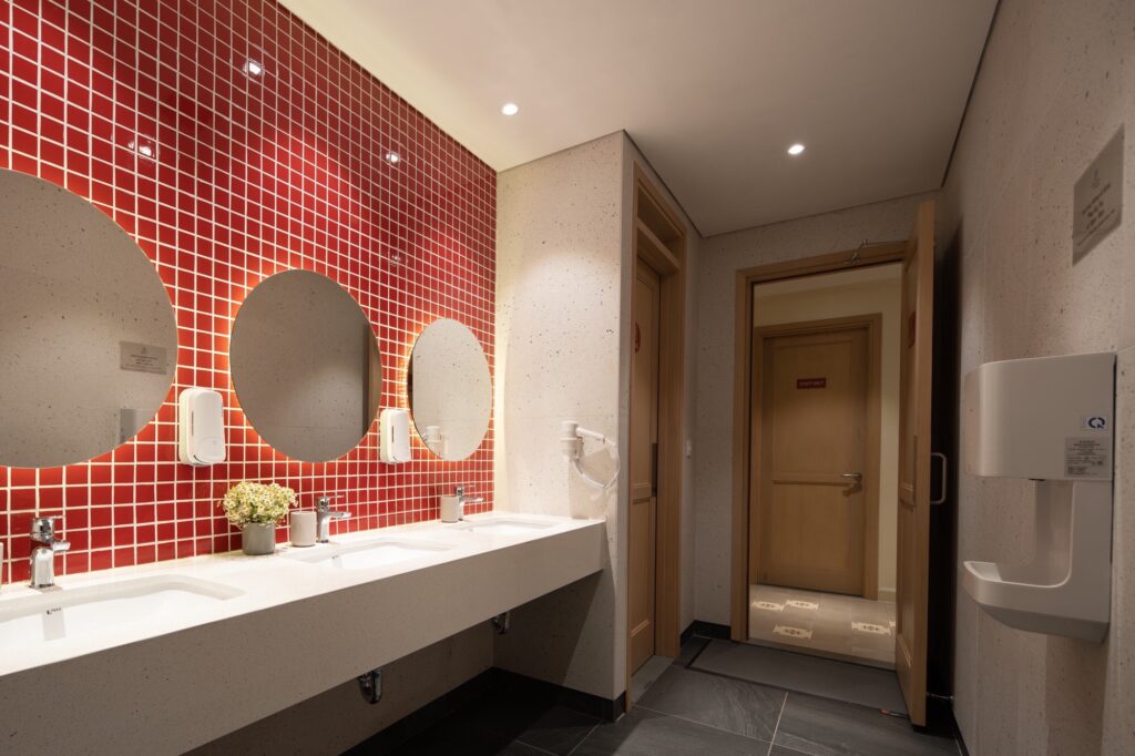 – Nhà vệ sinh trung tâm nằm ở mỗi tầng gồm có 3 nhà vệ sinh và 4 nhà tắm chia ra 2 khu nam nữ riêng biệt, có máy sấy tóc, sấy tay, lavabo
