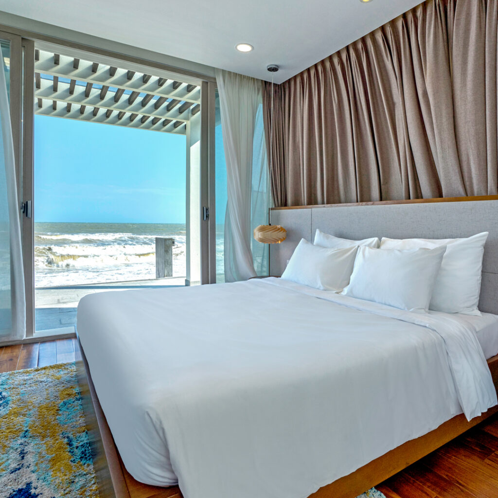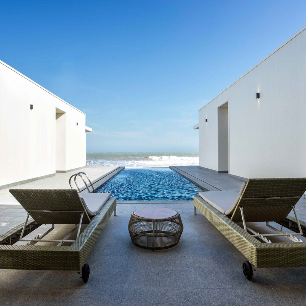 Nằm ngay sát bờ biển, căn biệt thự 4 phòng ngủ với kiến trúc tinh tế, cửa sổ rộng lớn nhìn ra biển, không gian sinh hoạt chung thoáng đãng với hồ bơi riêng biệt sẽ đem đến cho bạn và gia đình một kỳ nghỉ tuyệt vời.