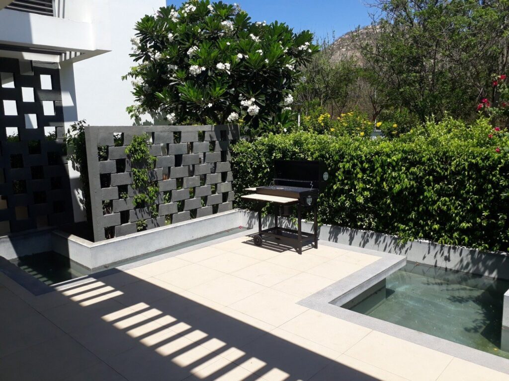 - Phía ngoài có sân vườn rất rộng, có thể tổ chức tiệc BBQ.