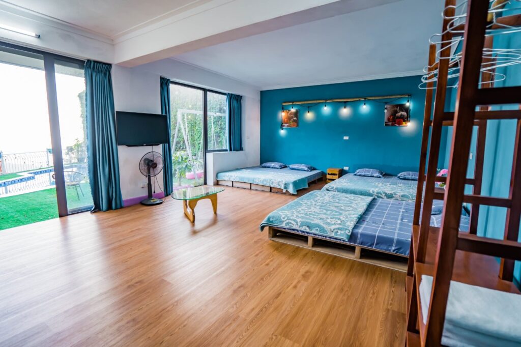 - Tầng trệt : bể bơi, sân vườn, phòng ngủ tập thể ( 2 giường 2m, 1 giường 1m6*2m, 1 giường 1m2)