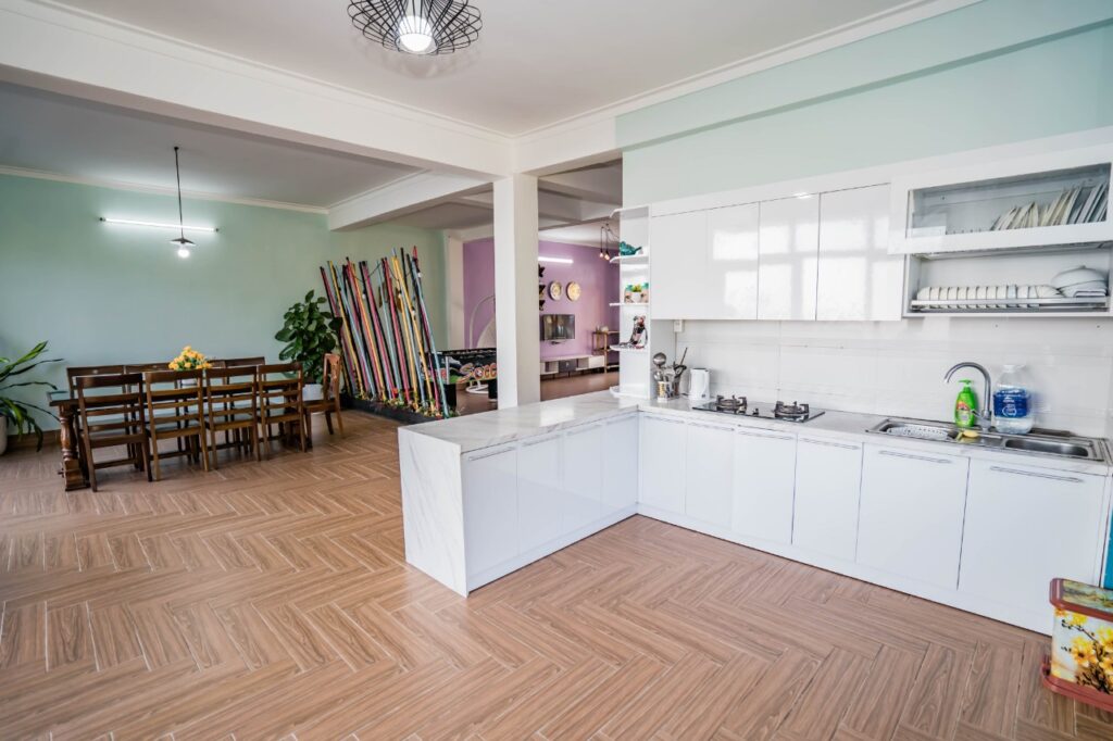 ? phòng bếp trang bị bếp gas, bàn ăn, tủ lạnh với đầy đủ bát đĩa, nồi nấu, nồi cơm điện