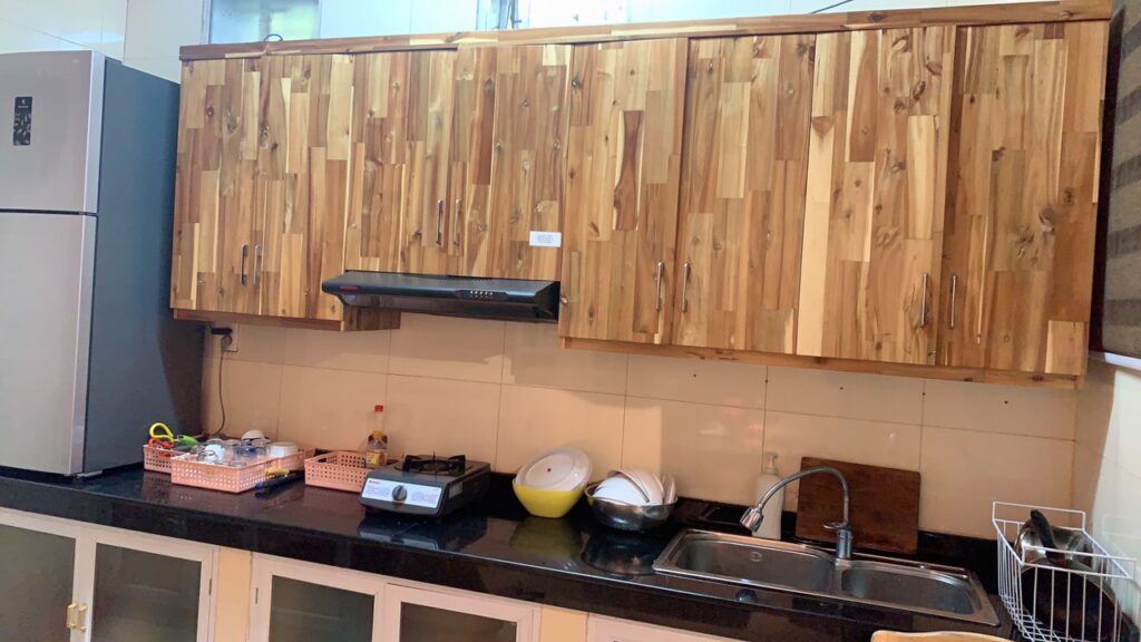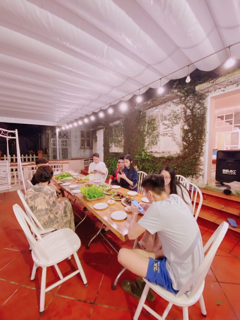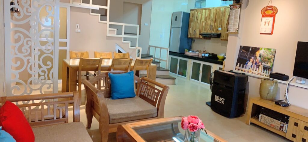 -trong nhà đầy đủ nội thất cơ bản như ti vi, tủ lạnh, điều hoà, bếp gas, lò vi sóng, nồi cơm điện, bát đũa đủ phục vụ đoàn trên dưới 20 người, loa kéo bluetooth, wifi.