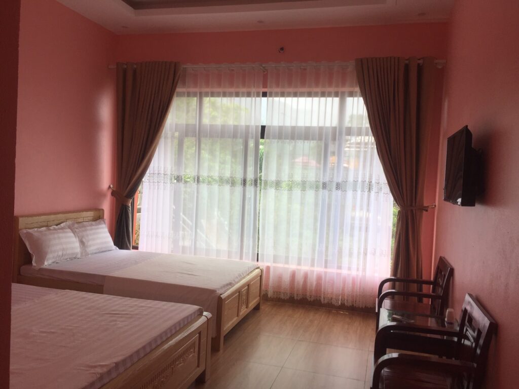 - Có 4 tầng, 9 phòng ngủ khép kín, 9 WC, 1 phòng tập thể có thể kê nệm, có nóng lạnh, điều hòa, có ti vi, trong đó có 4 phòng giường đôi 1m2 và 1m6, 5 phòng giường đơn 1m6*2m
